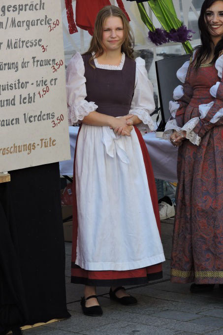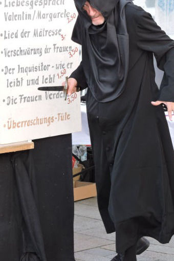 Eine Bude von vier Metern Länge und zwei Metern Tiefe stand in der Fußgängerzone der Verdener Innenstadt. In der Bude saßen einige der Darstellenden der diesjährigen Saison in ihren Kostümen und warteten – doch worauf? Schauspieler Uwe Pekau moderierte in seinem Kostüm des Dompredigers, und bot ausgewählte Szenen aus dem Stück "Die rebellische Hexe" an, welche für einen Obulus "gekauft" werden konnten und dann vorgeführt wurden. Und gleich zu Beginn zeigten sich die Besucher:innen offen für diese Art des kurzweiligen Theatervergnügens und kauften Szenen wie "Versuch des Dompredigers Margarethe zu ermorden", "Der Inquisitor wie er leibt und lebt", "Das Lied der Mätresse", "Liebesgespräch Valentin/Margarethe", "Verschwörung der Frauen" oder "Verdens Frauen".