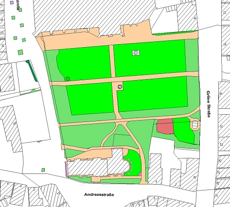 Der Domplatz liegt zwischen Domstraße, Andreasstraße und Grüne Straße.